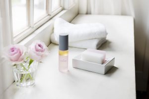 ③口元を手で覆いローズの香りで深呼吸し、お肌にやさしく馴染ませます。
