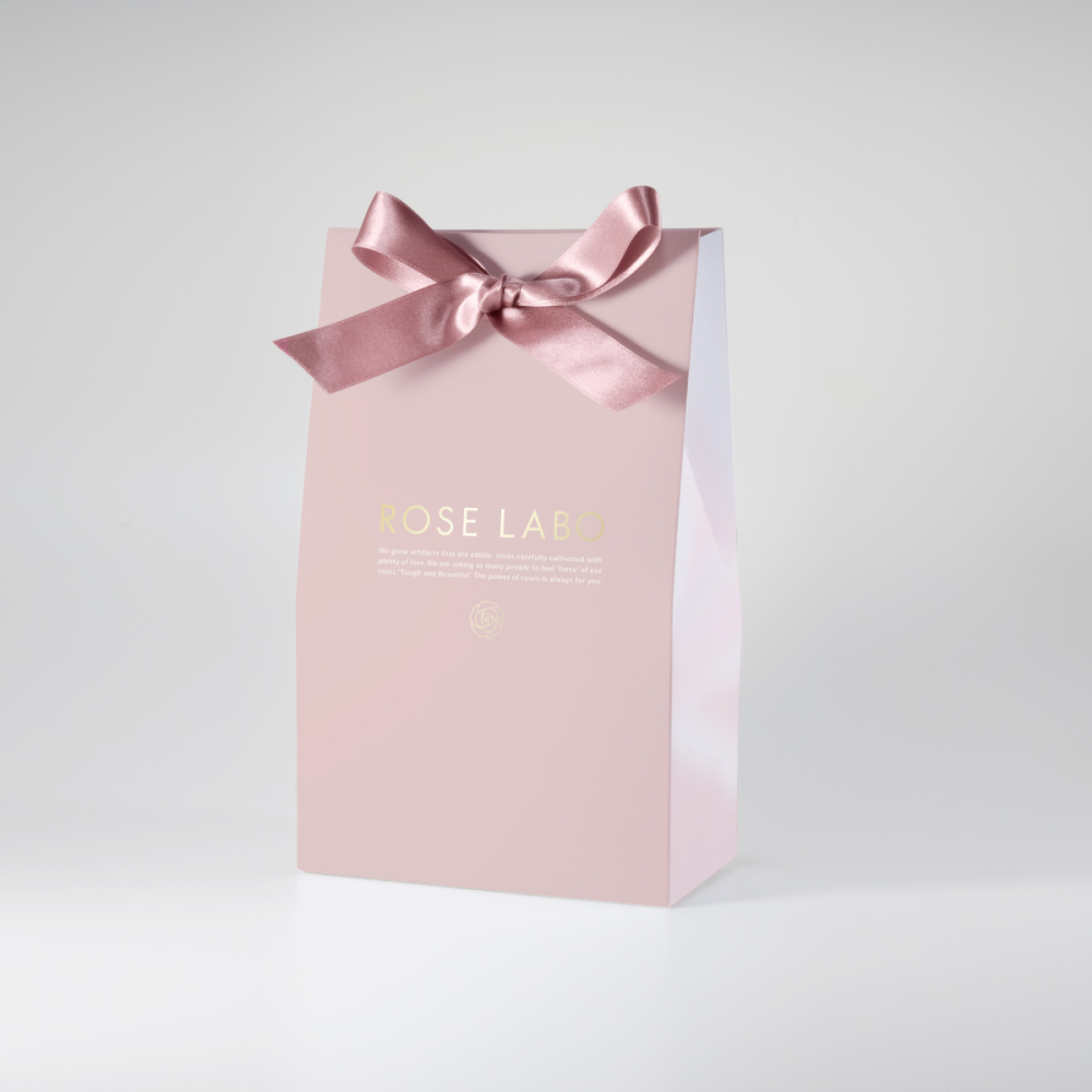バラを彩ったオリジナルリボンつきギフトバッグでお届けします。大切な方への贈り物にぴったりです。