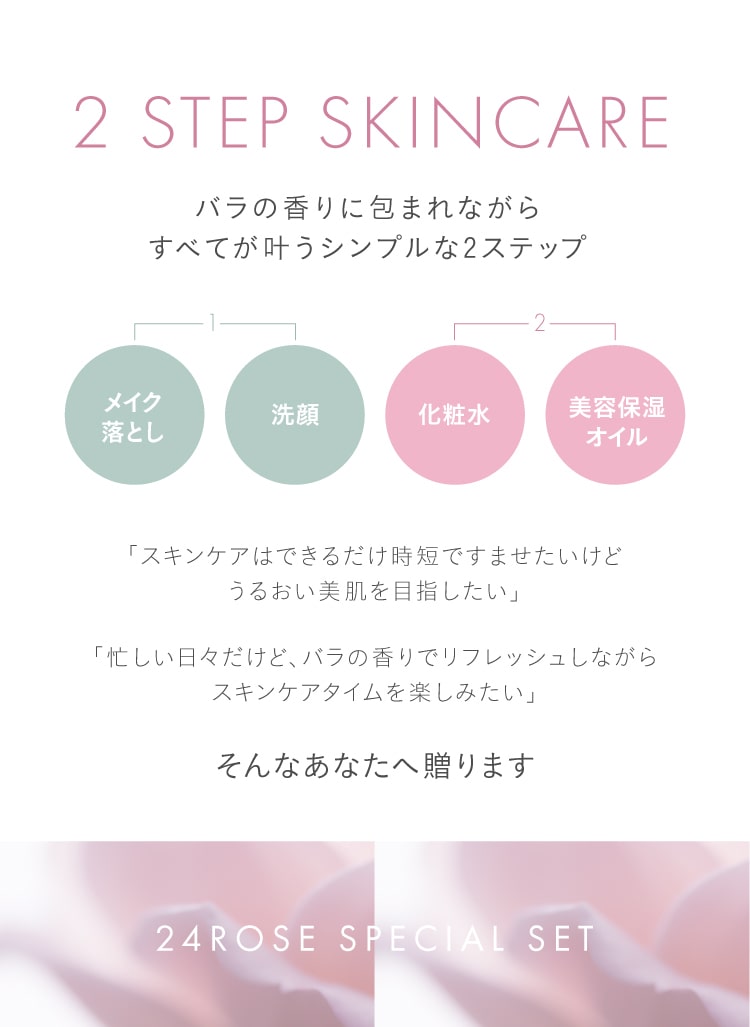 美容のために開発したROSE LABOのオリジナル品種「24(トゥエンティーフォー)」から抽出したローズウォーター*を高配合。