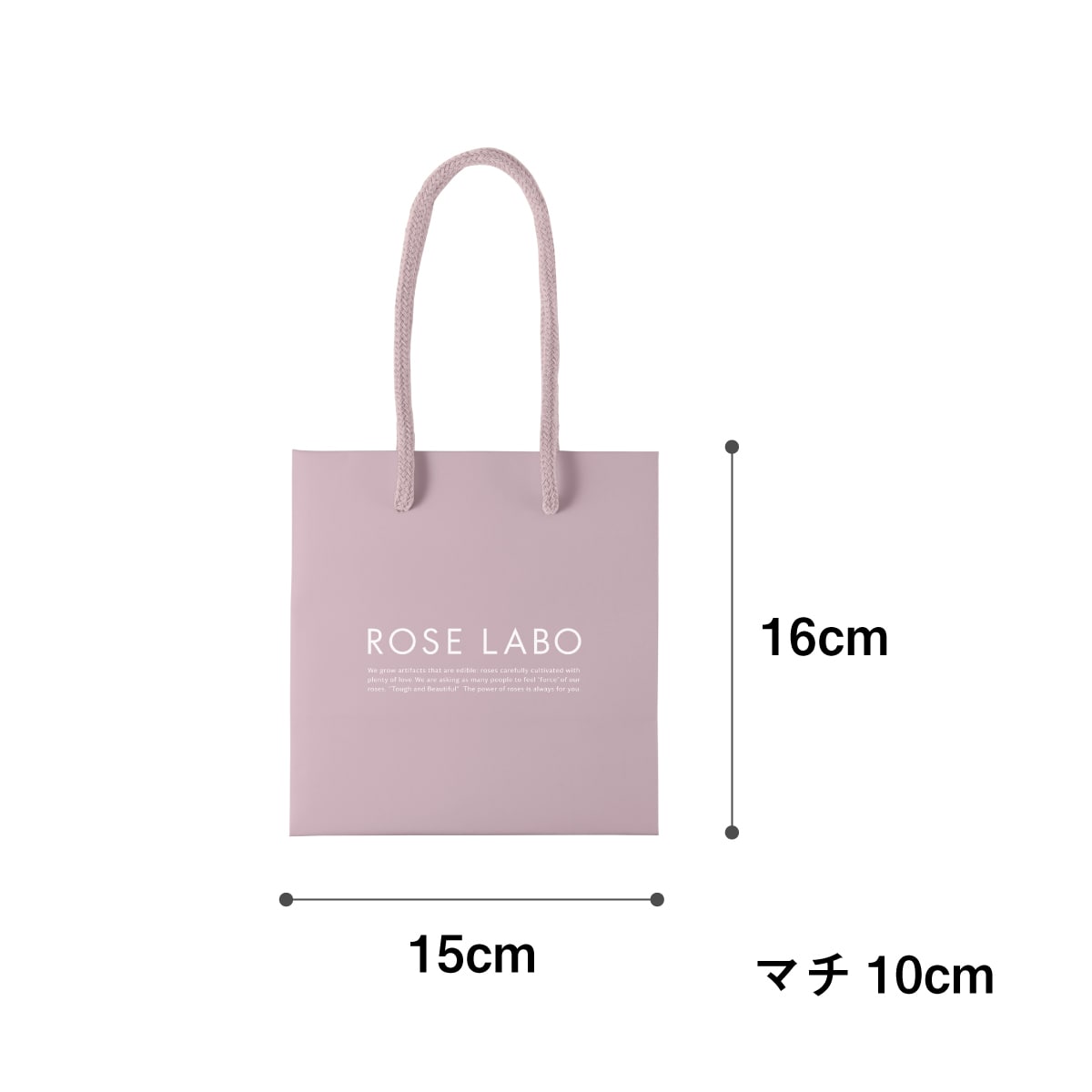 ROSE LABOのロゴ入りオリジナル手提げ袋。大切な方への贈り物に。 表面は耐久性を高めるため、フィルムでラミネート。サラサラとした上質な手触りです。 ※画像は「ショッピングバッグ(手提げ袋)」のサイズです。