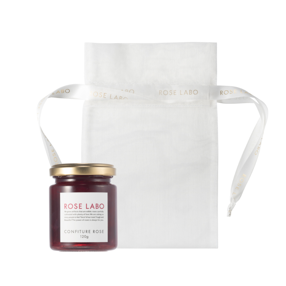 食べられるバラの花びらを贅沢に使用したコンフィチュールを柔らかなオーガンジー巾着袋でラッピング。